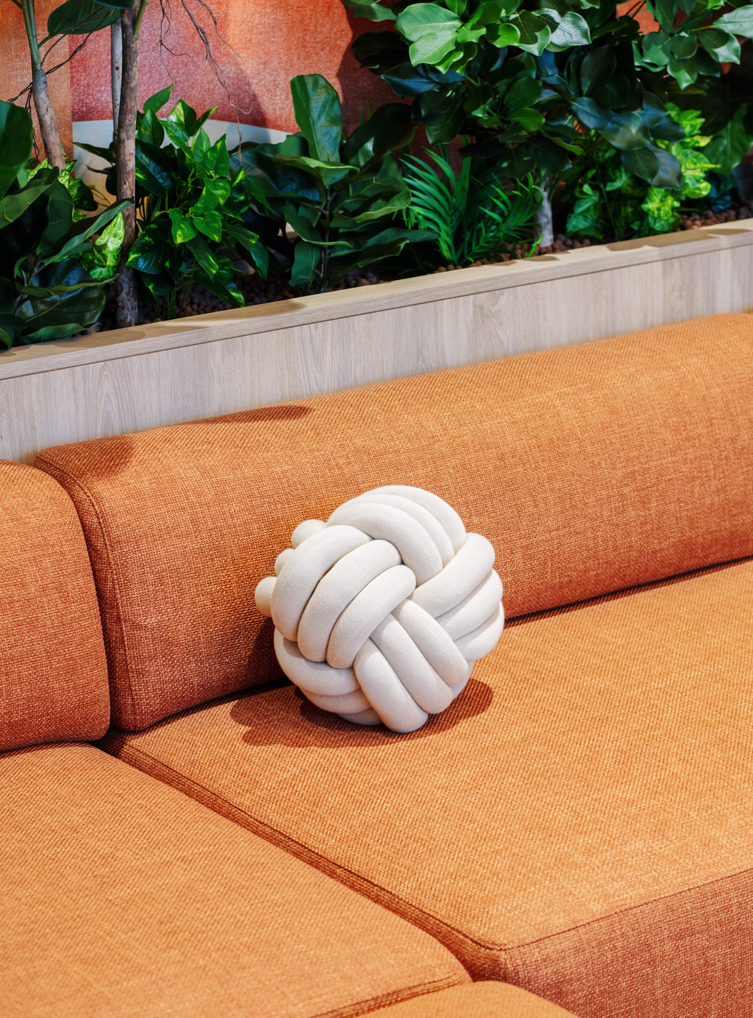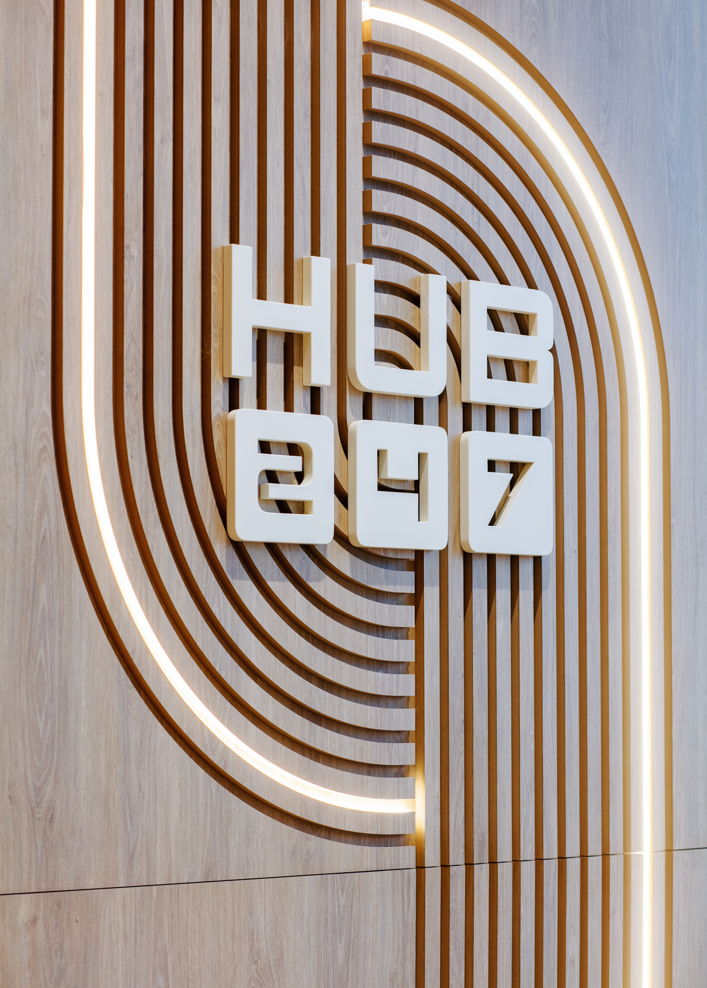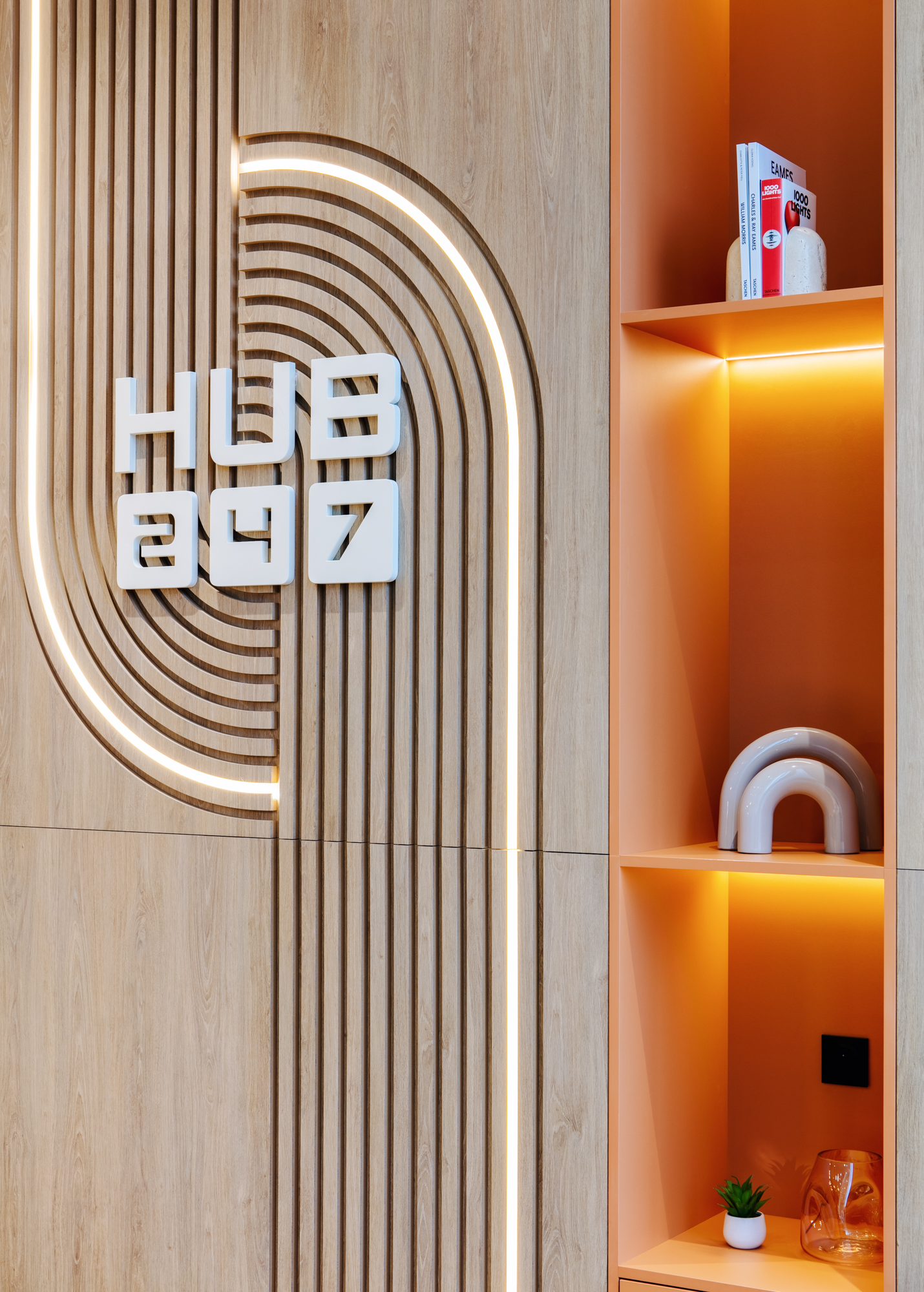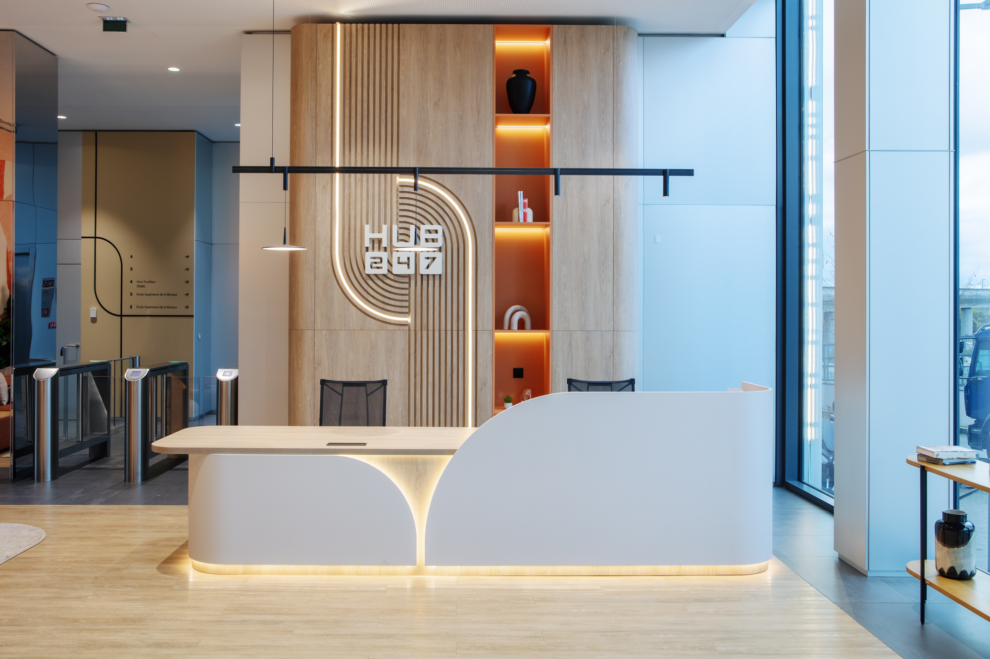 La palette de couleurs chaudes, associée aux matériaux naturels et aux jeux de lumière intégrés à l’agencement, renforce la sensation de confort et de convivialité. Pensé dans le détail, HUB 247 incarne un hall contemporain où le design sur mesure structure l’espace, valorise les usages et crée un lieu vivant, accueillant et durable.